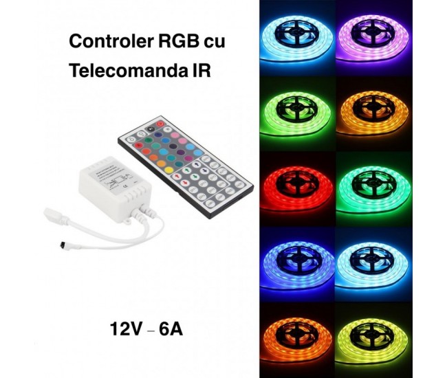 Controler de banda LED RGB cu telecomanda IR de 44 Taste, ce are o gama larga de culori,