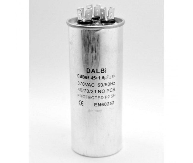 Model: CBB65Materialul invelitor: metal aluminiuMaterial dielectric: peliculă din polipropilenă metalizatăCapacitate: 45uf +1,5ufToleranță: ± 5%Tensiune nominală: 450V ACFrecventa: 50 / 60HzCuloare: argintiuFormă: cilindruFolosit frecvent la aparate de aer conditionat