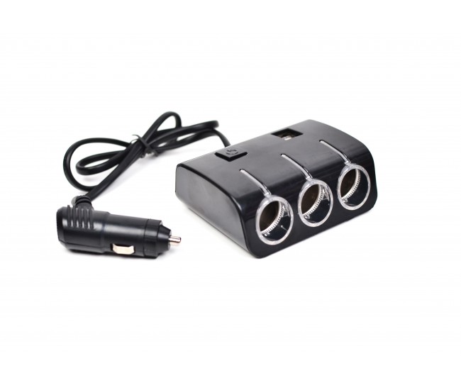 Adaptor Priza Bricheta Auto 3 Porturi Cu Iluminare Albastra 12V / 24V Culoare: Negru / Alb Soclu cu ieșire 12V / 24V Condițiile de lucru : Temperatura : 0 ° -60 ° C , umiditate relativă : 5 % -70 % 120W putere , pot fi folosite timp de 3 dispozitive în același timp Lungime cablu: 69 cm Greutate: 100 g